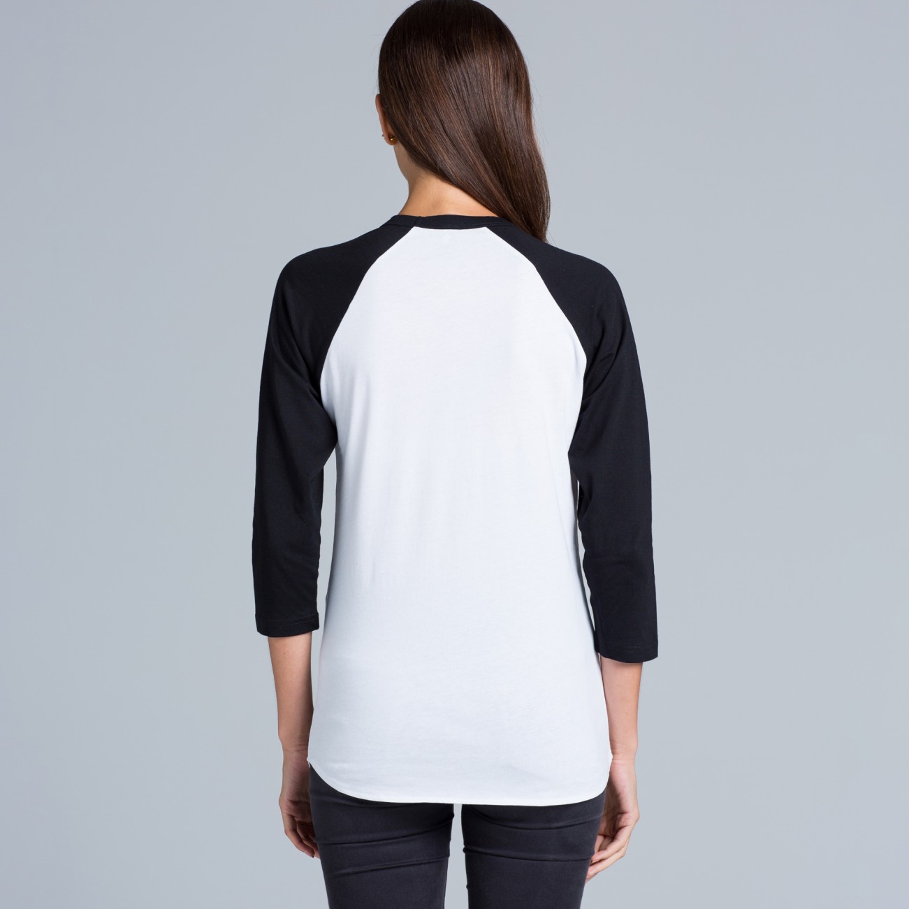 Crew neck, ¾ length raglan sleeves, curved tails
